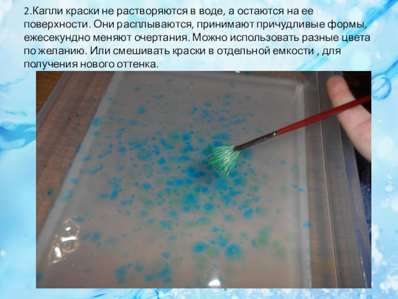 Слайд 72.Капли краски не растворяются в воде, а остаются на ее поверхности.