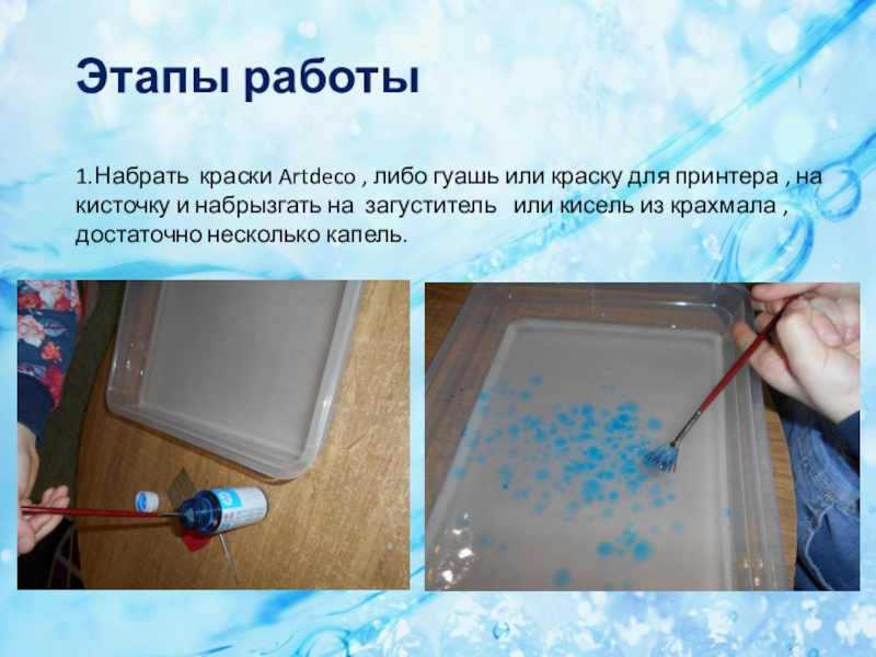 Artdeco на масляной основе синего и зеленого цветов либо краска для принтер, гуашь; вода с загустителем , либо прозрачный кисель; кисти-щетины; шило для работы с жидкими красками; бумажные салфетки; одноразовые тарелочки; плотные листы бумаги (по размеру лотка); фартук; кисти, вода.