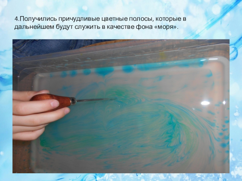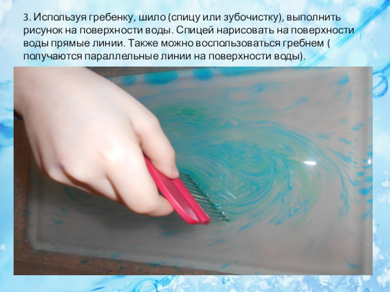 воды. Спицей нарисовать на поверхности воды прямые линии. Также можно воспользоваться гребнем ( получаются параллельные линии на поверхности воды).