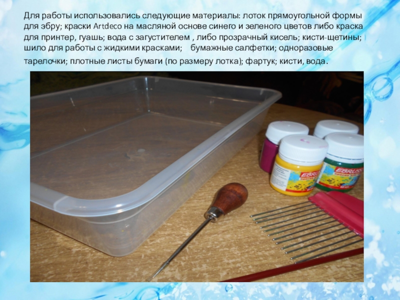 Слайд 5Для работы использовались следующие материалы: лоток прямоугольной формы для эбру; краски