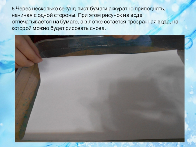 Слайд 116.Через несколько секунд лист бумаги аккуратно приподнять, начиная с одной стороны.