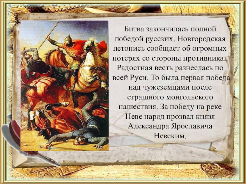 Радостная весть разнеслась по всей Руси. То была первая победа над чужеземцами после страшного монгольского нашествия. За победу на реке Неве народ прозвал князя Александра Ярославича Невским.