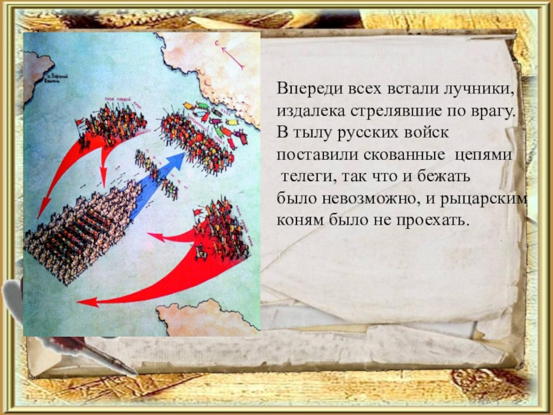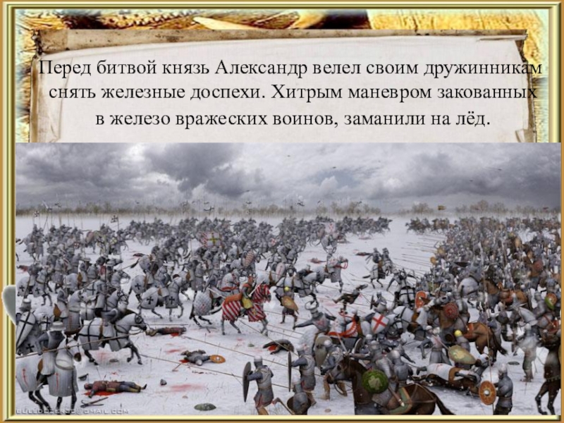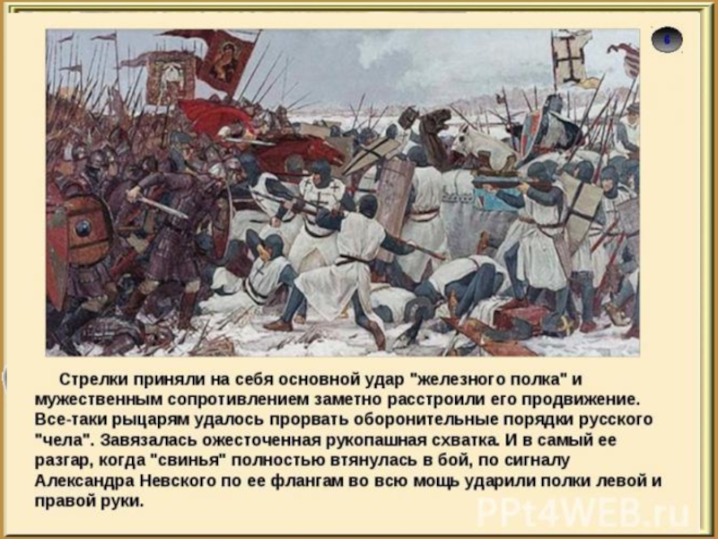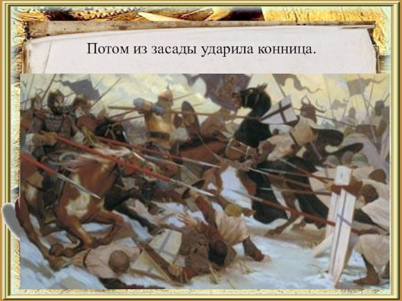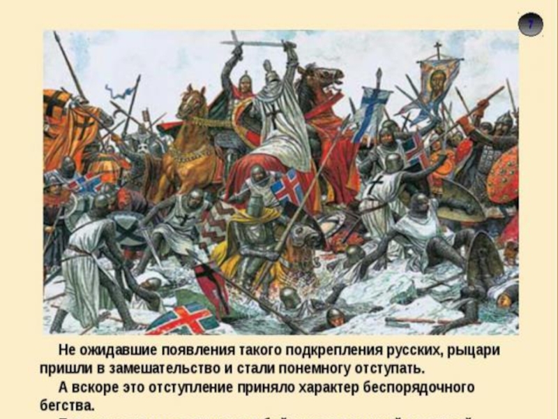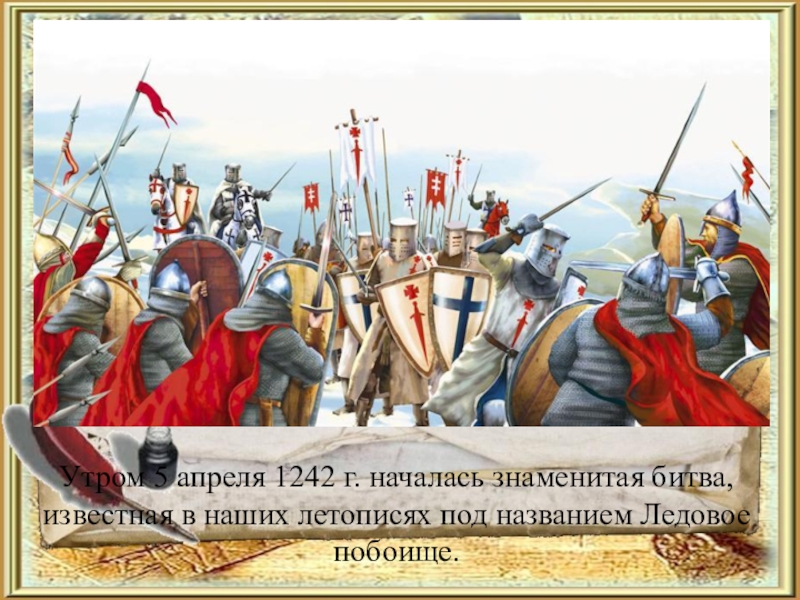 Слайд 17Утром 5 апреля 1242 г. началась знаменитая битва, известная в наших