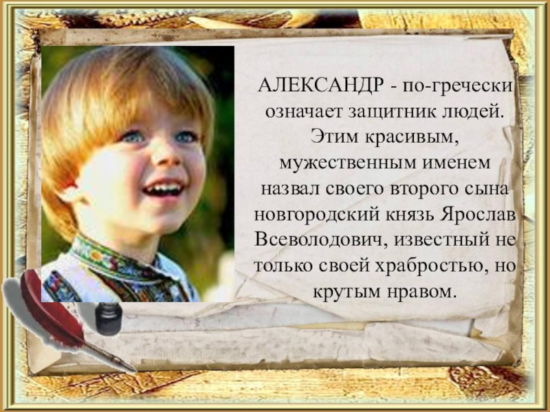 Слайд 4АЛЕКСАНДР - по-гречески означает защитник людей. Этим красивым, мужественным именем назвал