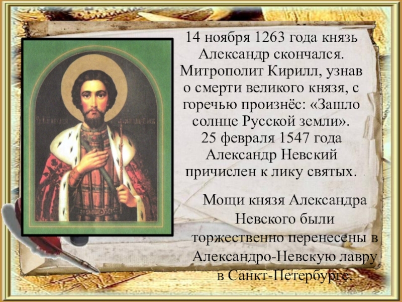 Слайд 2814 ноября 1263 года князь Александр скончался. Митрополит Кирилл, узнав о