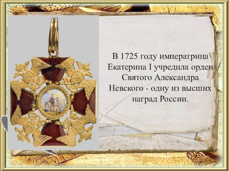 Слайд 29В 1725 году императрица Екатерина I учредила орден Святого Александра Невского