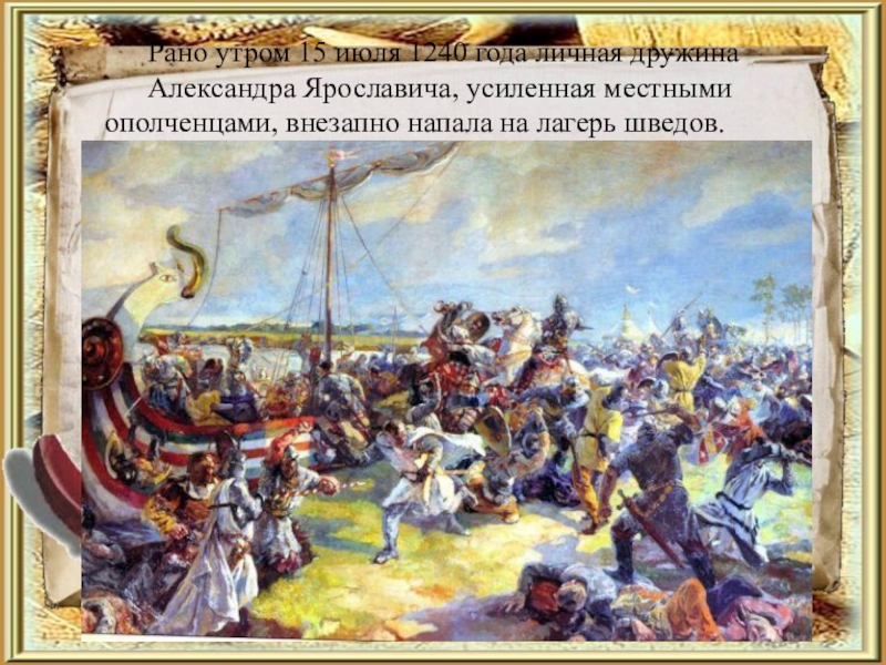 Слайд 14Рано утром 15 июля 1240 года личная дружина