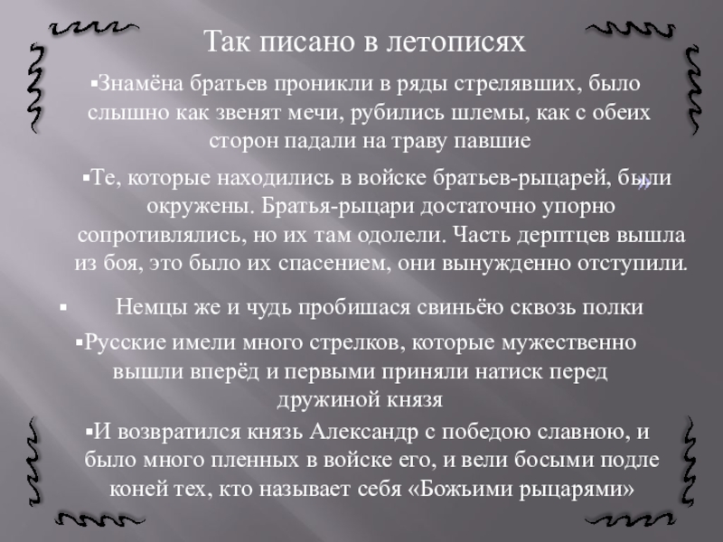 И возвратился князь Александр с победою славною, и было много пленных в войске его, и вели босыми подле коней тех, кто называет себя «Божьими рыцарями»