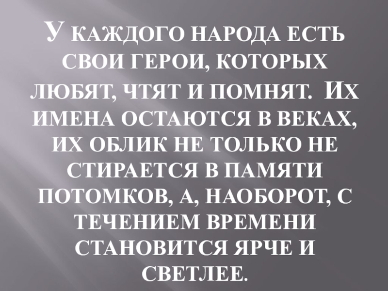Слайд 2У КАЖДОГО НАРОДА ЕСТЬ СВОИ ГЕРОИ, КОТОРЫХ ЛЮБЯТ, ЧТЯТ И ПОМНЯТ.