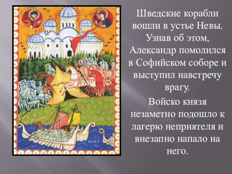 Слайд 13Шведские корабли вошли в устье Невы. Узнав об этом, Александр помолился
