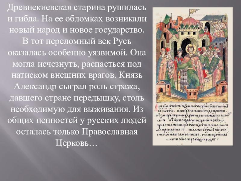 государство. В тот переломный век Русь оказалась особенно уязвимой. Она могла исчезнуть, распасться под натиском внешних врагов. Князь Александр сыграл роль стража, давшего стране передышку, столь необходимую для выживания. Из общих ценностей у русских людей осталась только Православная Церковь…