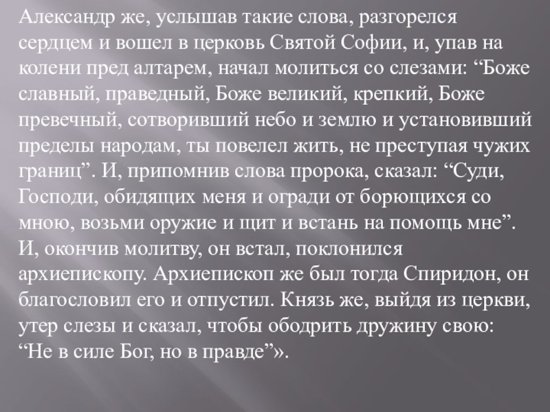 и, упав на колени пред алтарем, начал молиться со слезами: “Боже славный, праведный, Боже великий, крепкий, Боже превечный, сотворивший небо и землю и установивший пределы народам, ты повелел жить, не преступая чужих границ”. И, припомнив слова пророка, сказал: “Суди, Господи, обидящих меня и огради от борющихся со мною, возьми оружие и щит и встань на помощь мне”. И, окончив молитву, он встал, поклонился архиепископу. Архиепископ же был тогда Спиридон, он благословил его и отпустил. Князь же, выйдя из церкви, утер слезы и сказал, чтобы ободрить дружину свою: “Не в силе Бог, но в правде”».