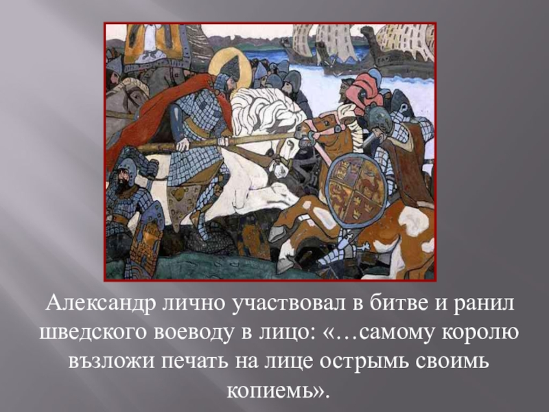 Слайд 14 Александр лично участвовал в битве и ранил шведского воеводу в