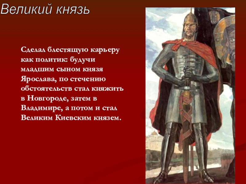 князь новгородский, киевский, владимирский. Был сыном переяславльского князя. В 1225 году в биографии Александра Невского произошло посвящение в воины.