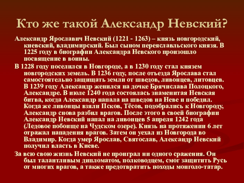 Когда же ливонцы взяли Псков, Тёсов, подобрались к Новгороду, Александр снова разбил врагов. После этого в своей биографии Александр Невский напал на ливонцев 5 апреля 1242 года (Ледовое побоище на Чудском озере). Князь на протяжении 6 лет отражал нападения врагов. Затем он уехал из Новгорода во Владимир. Когда умер Ярослав, Святослав, Александр Невский получил власть в Киеве.