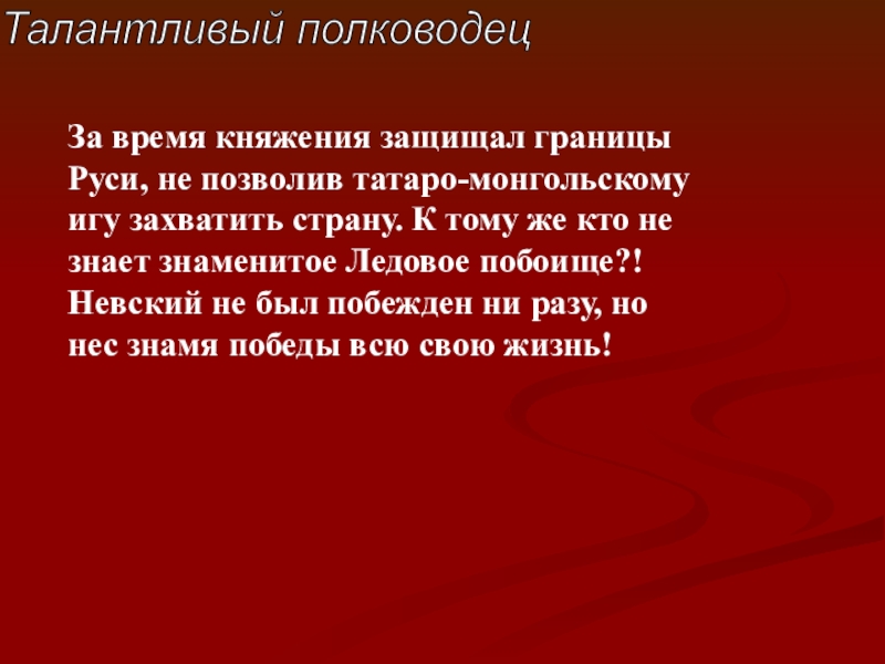 игу захватить страну. К тому же кто не знает знаменитое Ледовое побоище?! Невский не был побежден ни разу, но нес знамя победы всю свою жизнь!