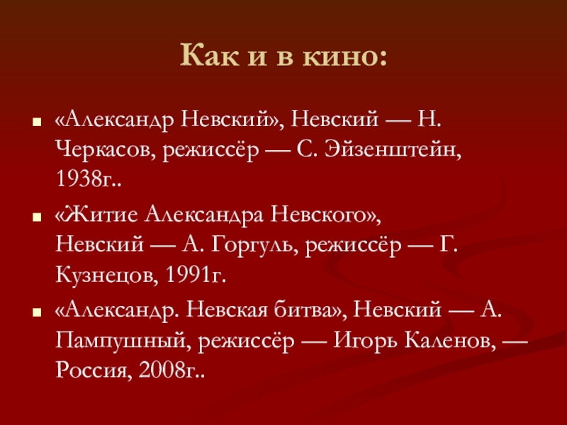 «Александр. Невская битва», Невский — А. Пампушный, режиссёр — Игорь Каленов, — Россия, 2008г..