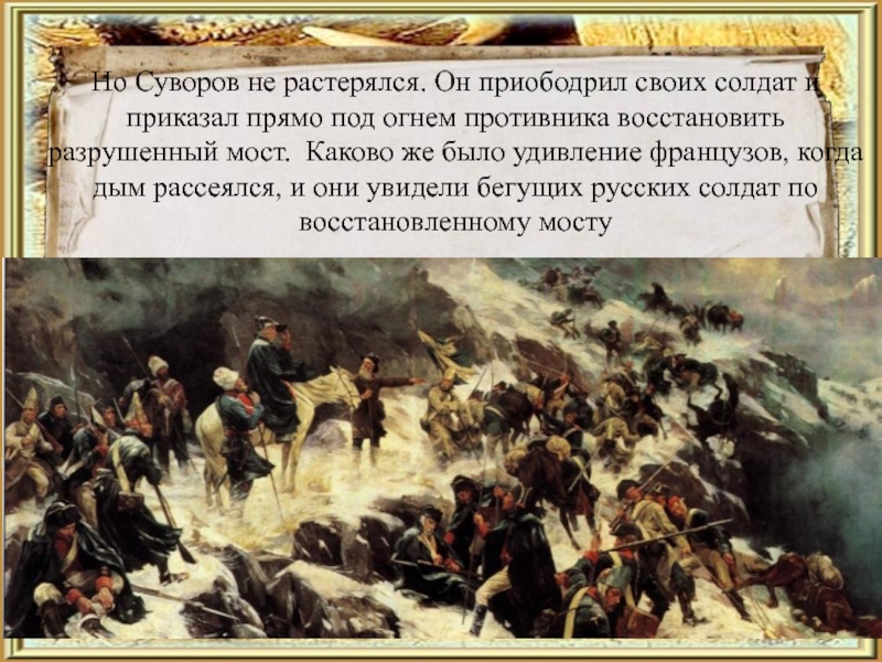 Слайд 16Но Суворов не растерялся. Он приободрил своих солдат и приказал прямо