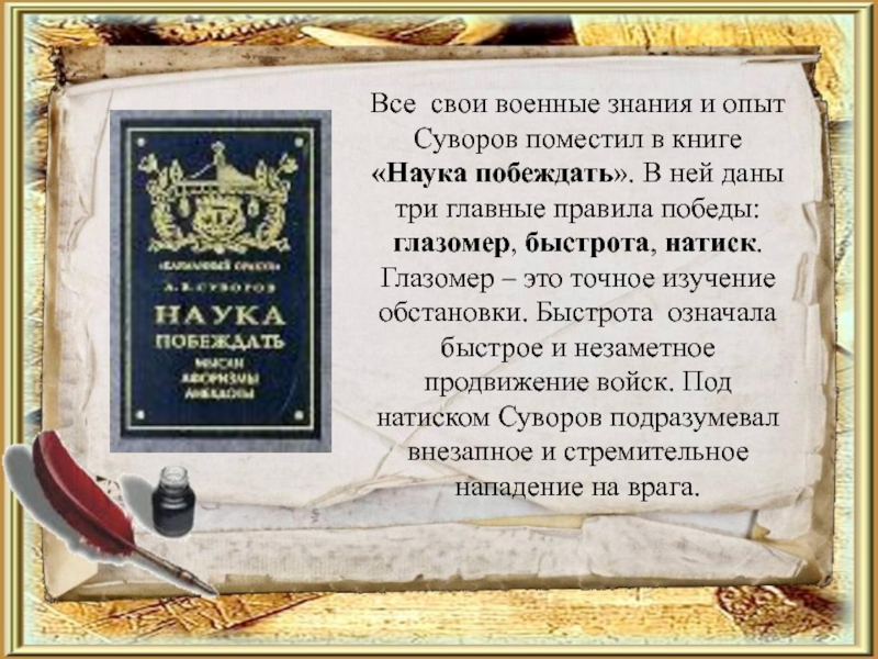побеждать». В ней даны три главные правила победы: глазомер, быстрота, натиск. Глазомер – это точное изучение обстановки. Быстрота означала быстрое и незаметное продвижение войск. Под натиском Суворов подразумевал внезапное и стремительное нападение на врага.