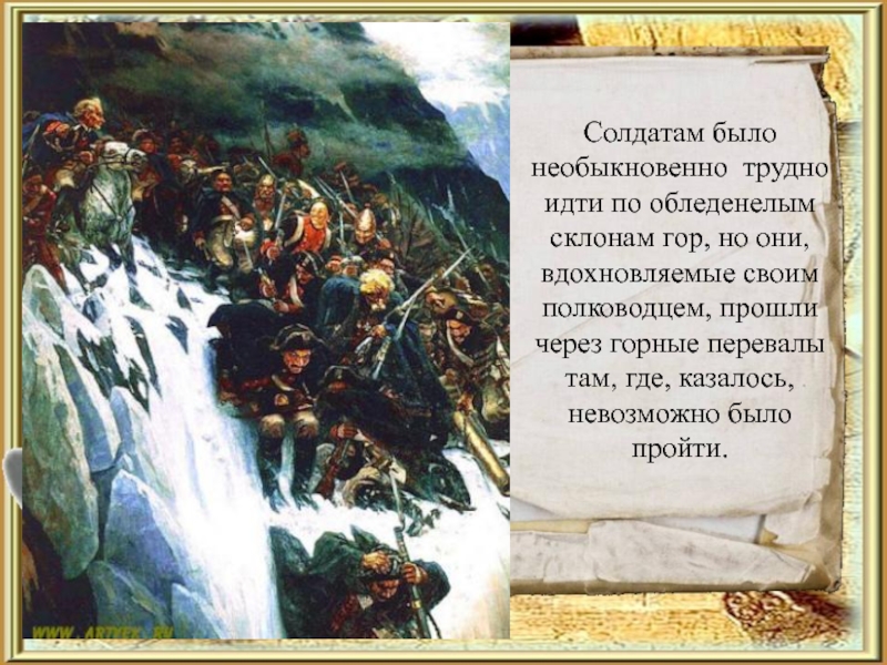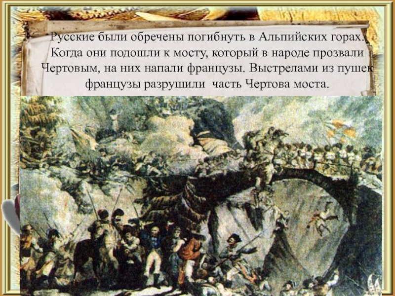 Слайд 15Русские были обречены погибнуть в Альпийских горах. Когда они подошли к