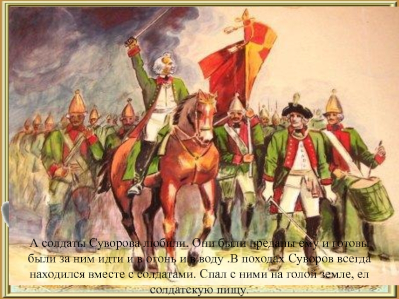 Слайд 18А солдаты Суворова любили. Они были преданы ему и готовы были