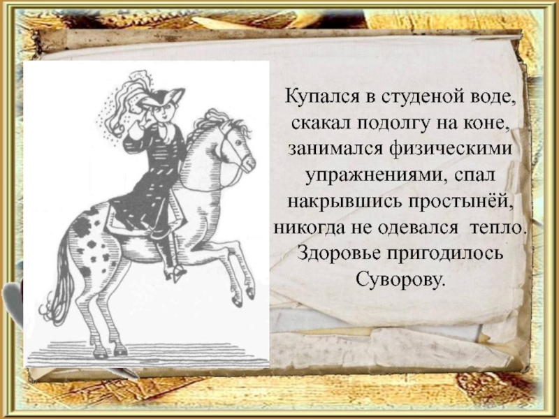 Слайд 7Купался в студеной воде, скакал подолгу на коне, занимался физическими упражнениями,