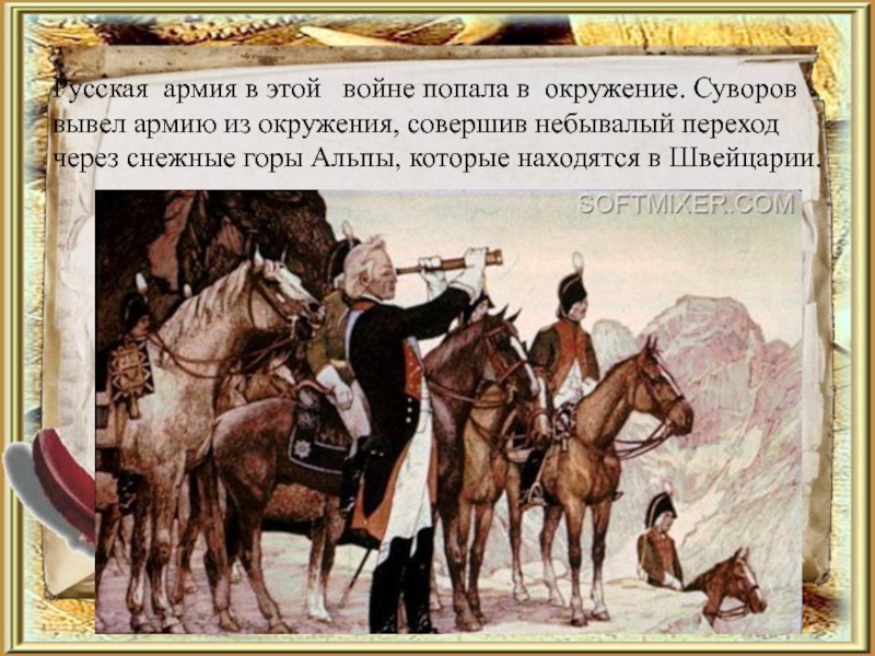 Слайд 13Русская армия в этой войне попала в окружение. Суворов вывел армию