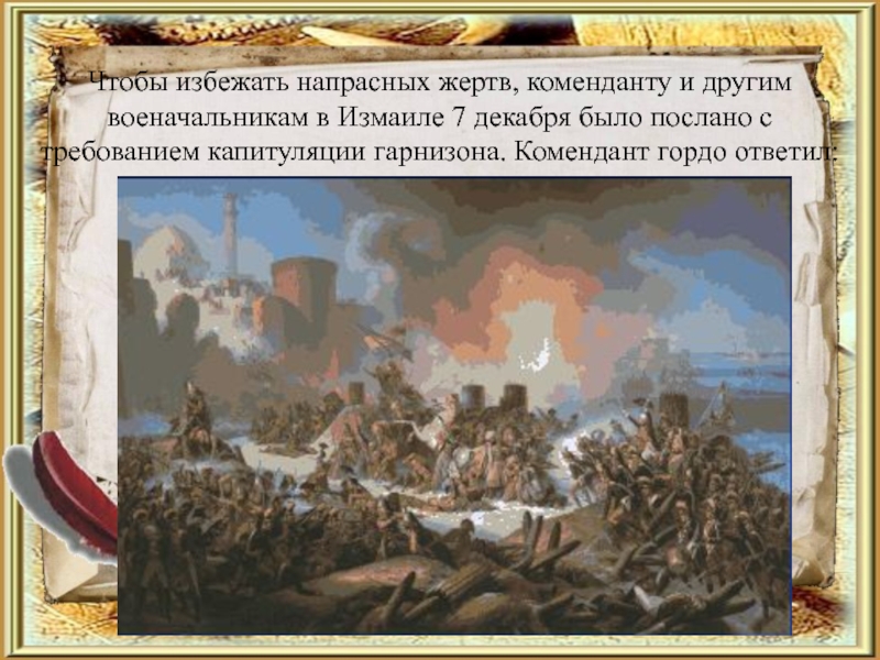Слайд 10Чтобы избежать напрасных жертв, коменданту и другим военачальникам в Измаиле 7