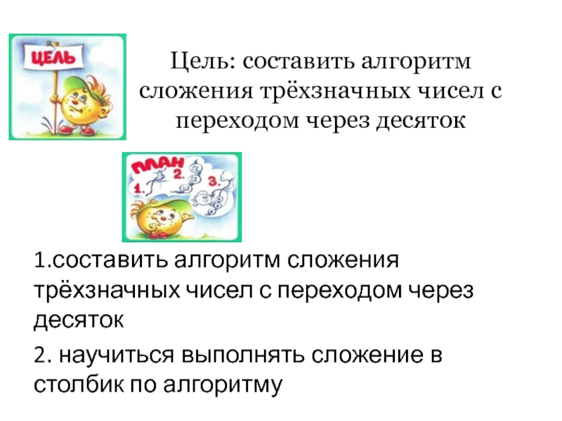 Слайд 9Цель: составить алгоритм сложения трёхзначных чисел с переходом через десяток