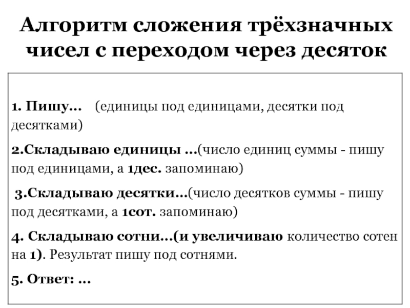 Цель: составить алгоритм сложения трёхзначных чисел с переходом через десяток1.составить алгоритм сложения трёхзначных чисел с переходом через