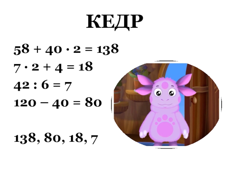 КЕДР58 + 40 ∙ 2 = 138 7 ∙ 2 + 4 = 18 42 : 6