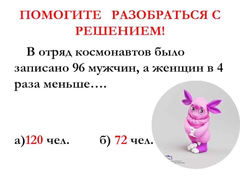 ПОМОГИТЕ  РАЗОБРАТЬСЯ С РЕШЕНИЕМ!	В отряд космонавтов было записано 96 мужчин, а женщин в 4 раза меньше….а)120