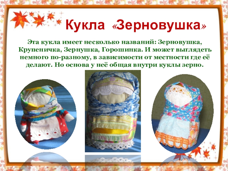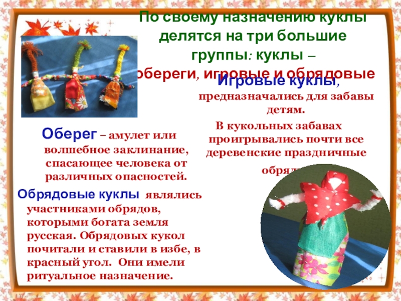 Обрядовые куклы являлись участниками обрядов, которыми богата земля русская. Обрядовых кукол почитали и ставили в избе, в красный угол. Они имели ритуальное назначение.