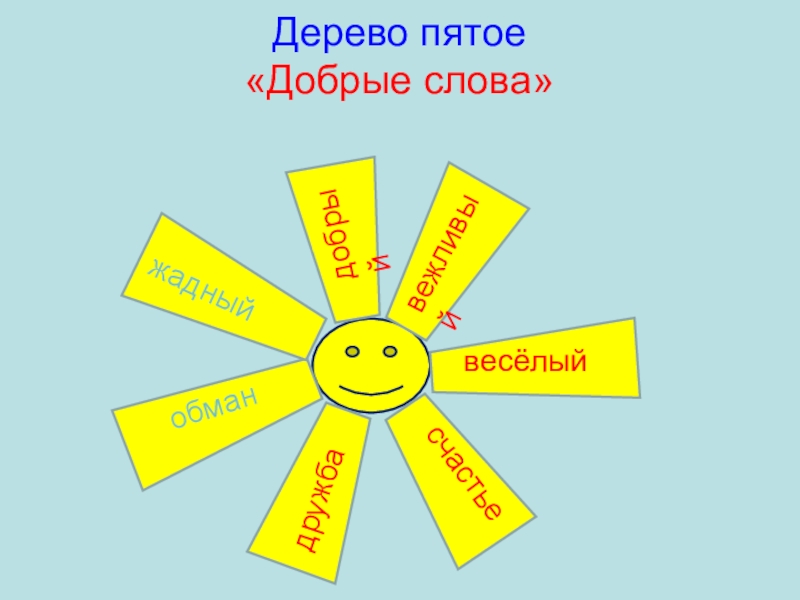 Дерево пятое «Добрые слова» грубыйгрубыйвежливыйдобрыйжадныйвесёлыйсчастьедружбаправда