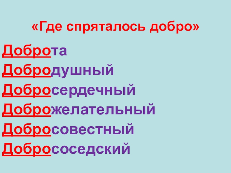 «Где спряталось добро»  ДобротаДобродушныйДобросердечныйДоброжелательныйДобросовестныйДобрососедский