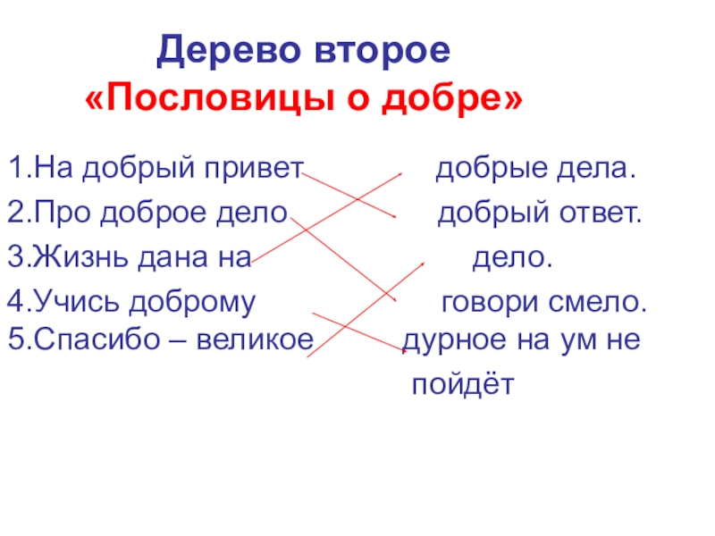 Дерево второе «Пословицы о добре» 1.На добрый привет        добрые дела.2.Про