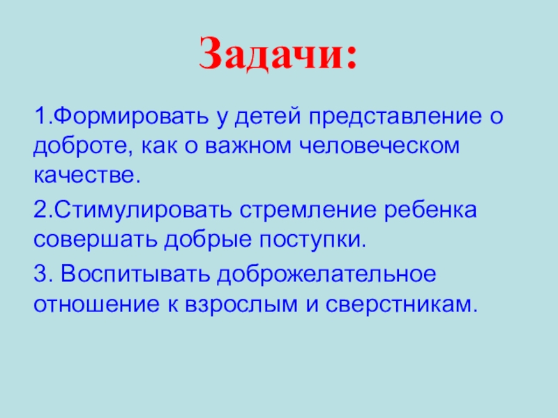 Задачи:1.Формировать у детей представление о доброте, как о важном человеческом качестве.2.Стимулировать стремление ребенка совершать добрые поступки.3. Воспитывать