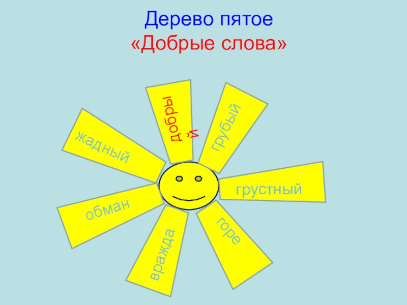 Дерево пятое «Добрые слова» грубыйгрубыйвежливыйдобрыйжадныйгрустныйгоревраждаобман