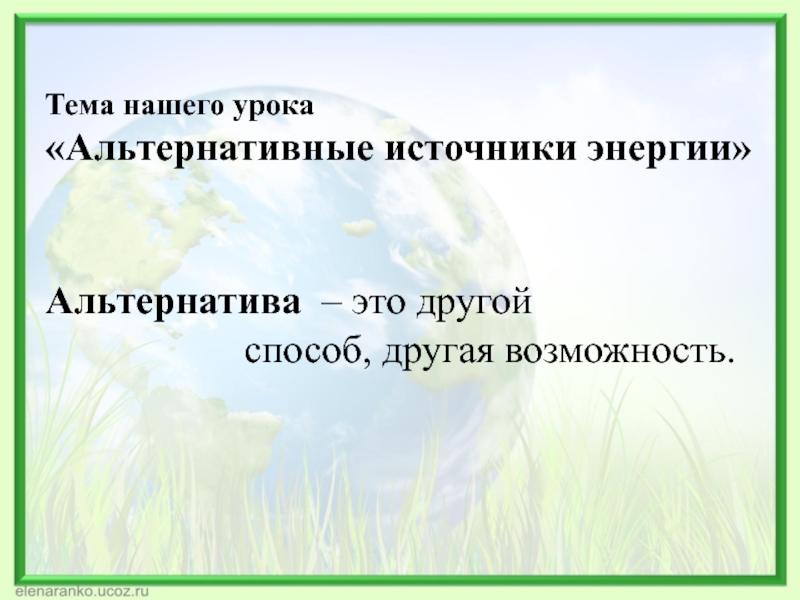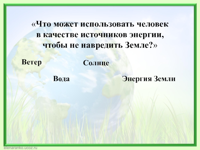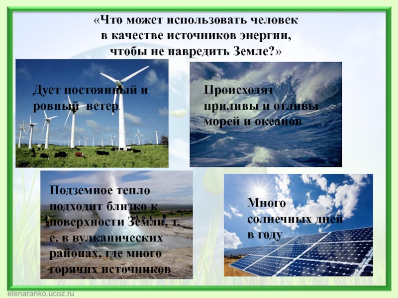 Использование энергии ветра, морских волн, горячих подземных источников и энергии солнца.