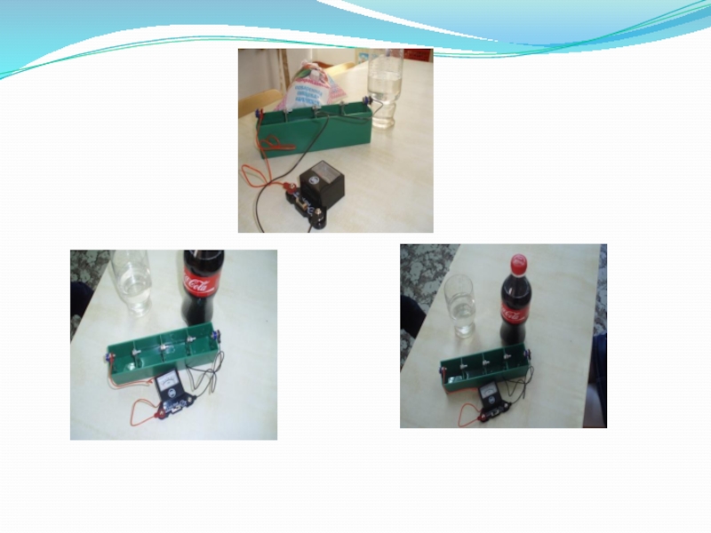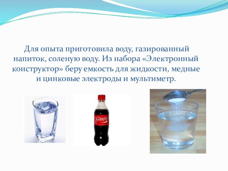 Слайд 13 Для опыта приготовила воду, газированный напиток, соленую воду. Из