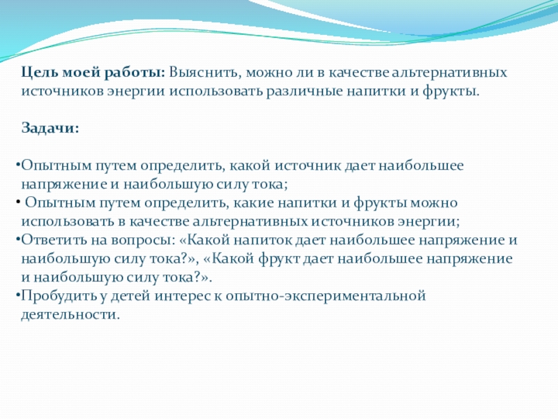 Опытным путем определить, какие напитки и фрукты можно использовать в качестве альтернативных источников энергии;
