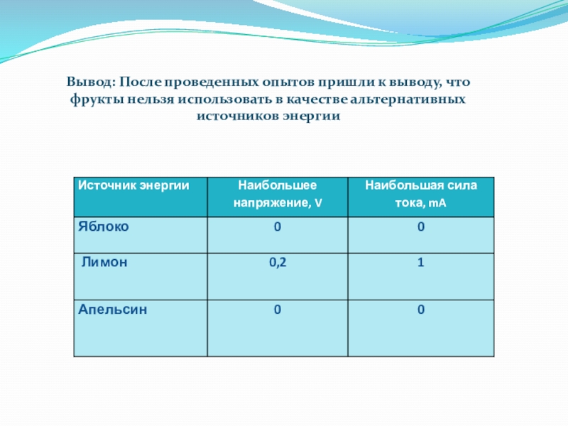 Слайд 19Вывод: После проведенных опытов пришли к выводу, что фрукты нельзя использовать