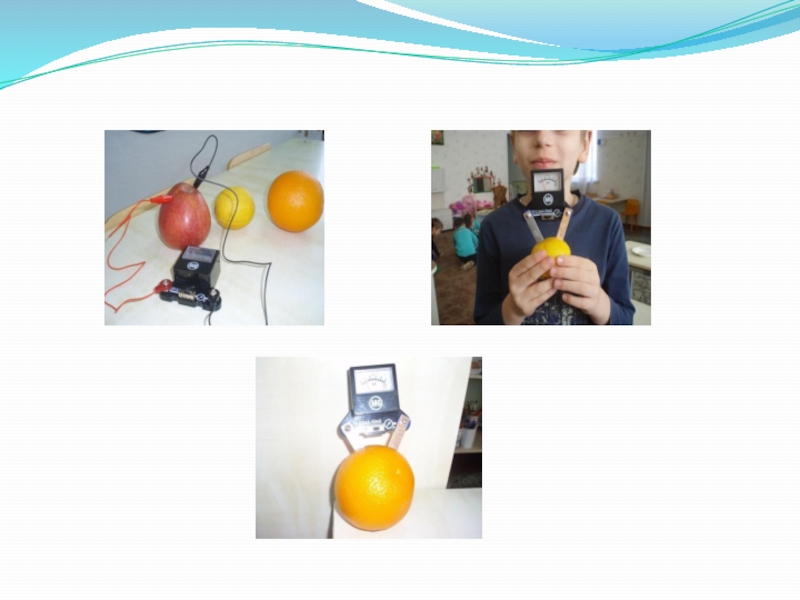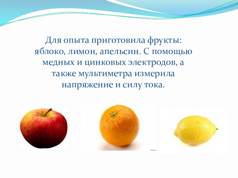 Слайд 17Для опыта приготовила фрукты: яблоко, лимон, апельсин. С помощью медных и