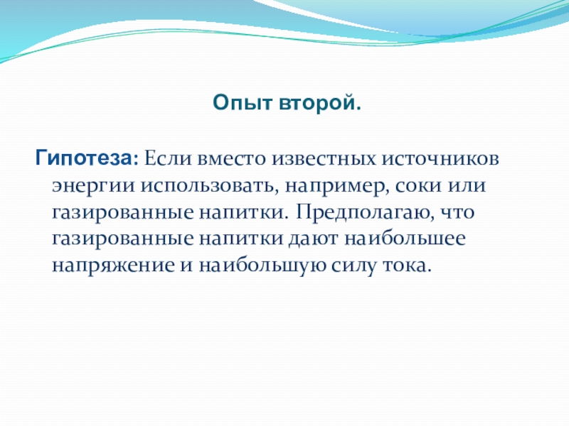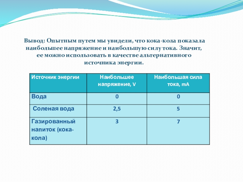 Слайд 15Вывод: Опытным путем мы увидели, что кока-кола показала наибольшее напряжение и