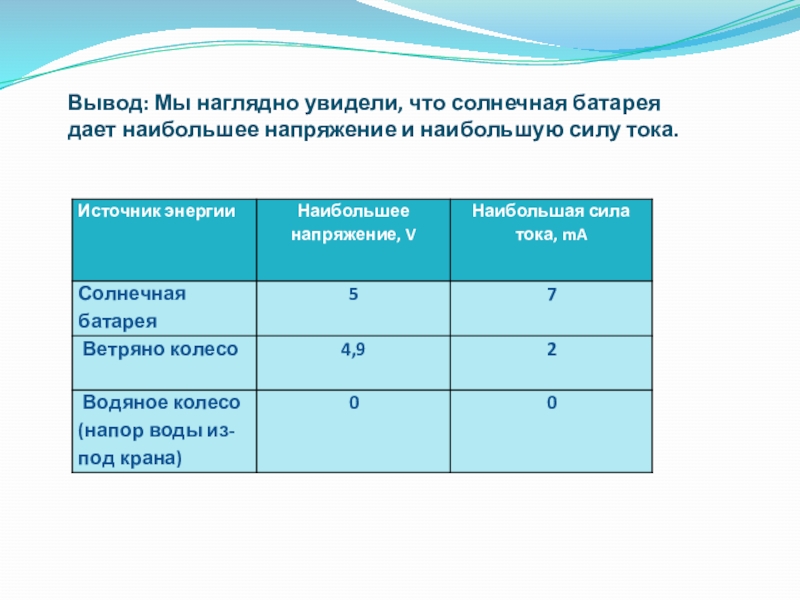 Вывод: Мы наглядно увидели, что солнечная батарея дает наибольшее напряжение и