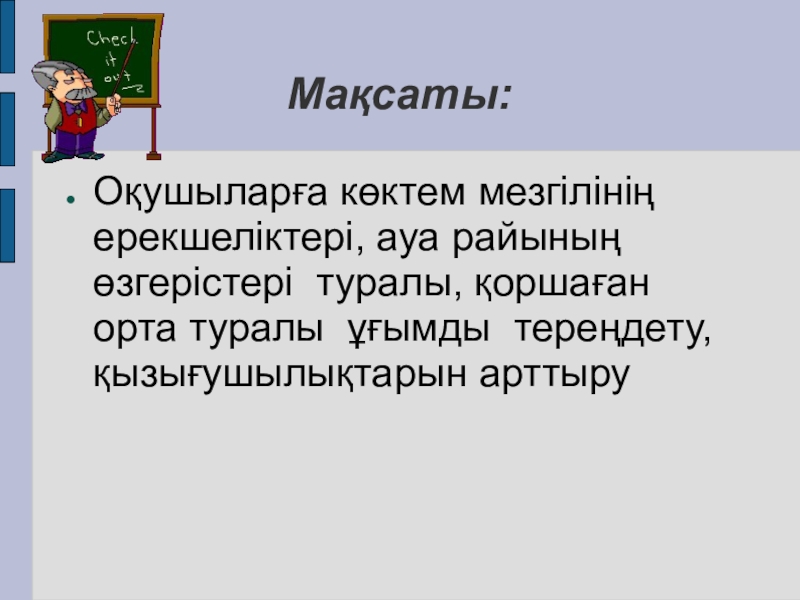 Мақсаты:Оқушыларға көктем мезгілінің ерекшеліктері, ауа райының өзгерістері туралы, қоршаған орта туралы ұғымды тереңдету, қызығушылықтарын арттыру
