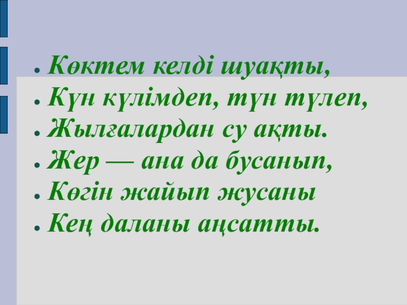 Көктем келді шуақты,Күн күлімдеп, түн түлеп,Жылғалардан су ақты.Жер — ана да бусанып,Көгін жайып жусаныКең даланы аңсатты.
