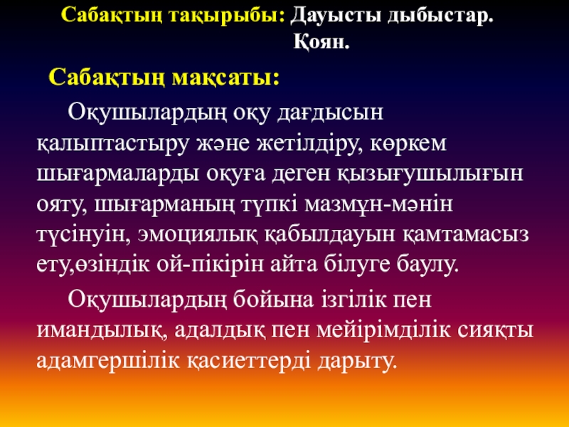 Оқушылардың оқу дағдысын қалыптастыру және жетілдіру, көркем шығармаларды оқуға деген қызығушылығын ояту, шығарманың түпкі мазмұн-мәнін түсінуін, эмоциялық қабылдауын қамтамасыз ету,өзіндік ой-пікірін айта білуге баулу.