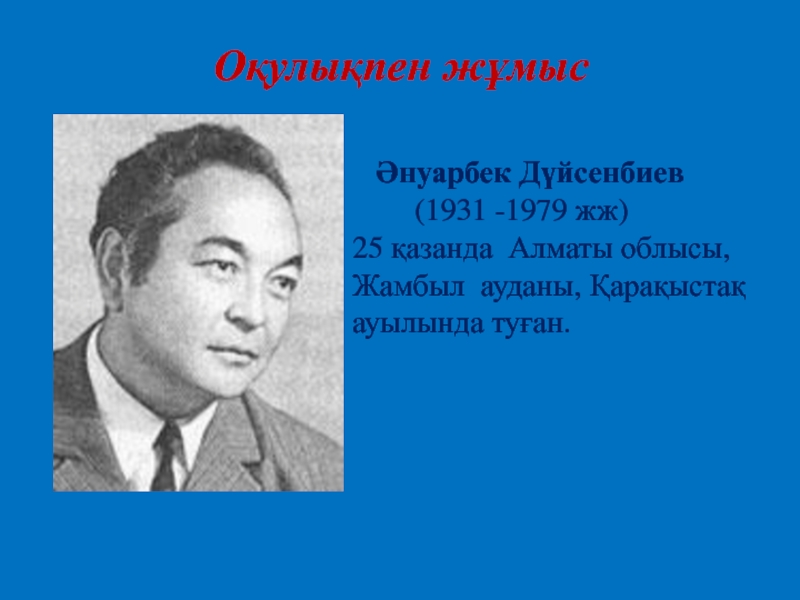 Оқулықпен жұмыс  Әнуарбек Дүйсенбиев      (1931 -1979 жж) 25 қазанда Алматы облысы, Жамбыл ауданы, Қарақыстақ