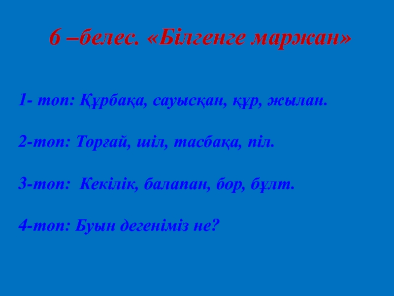 6 –белес. «Білгенге маржан»1- топ: Құрбақа, сауысқан, құр, жылан.2-топ: Торғай, шіл, тасбақа, піл.3-топ: Кекілік, балапан, бор, бұлт.